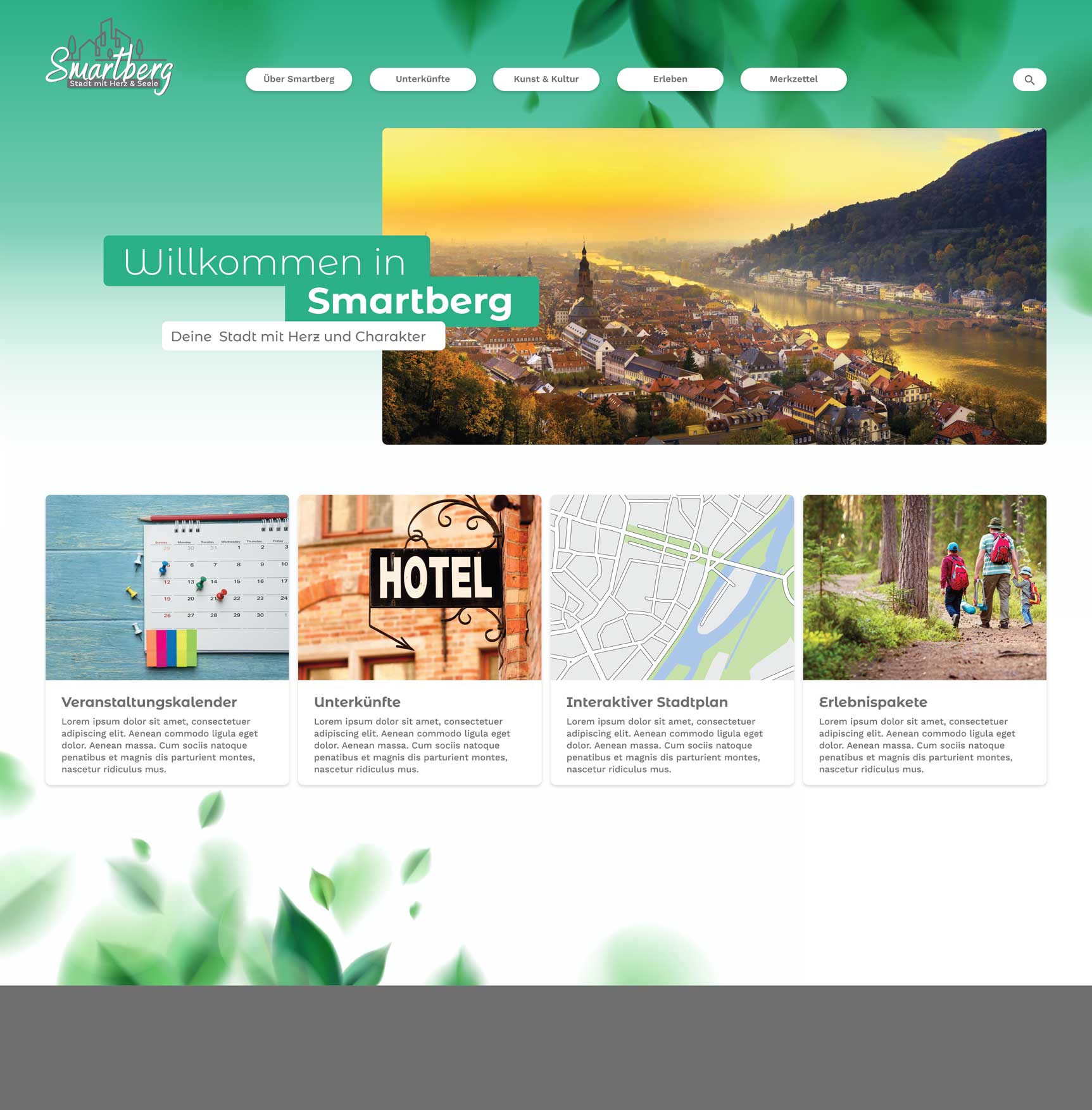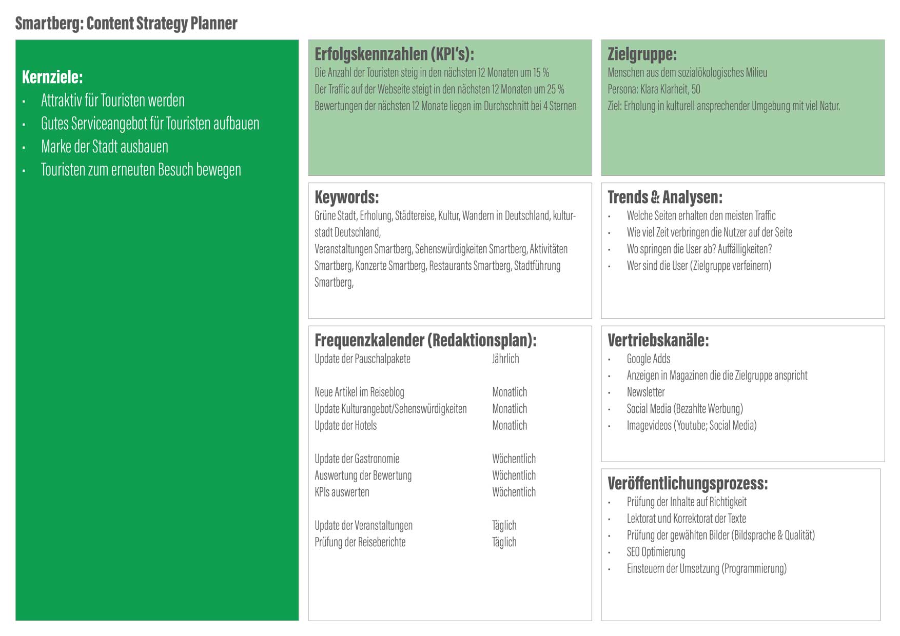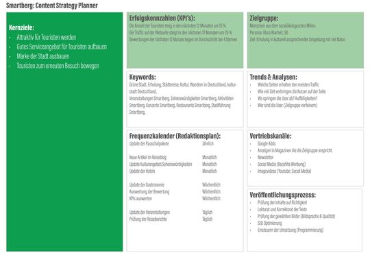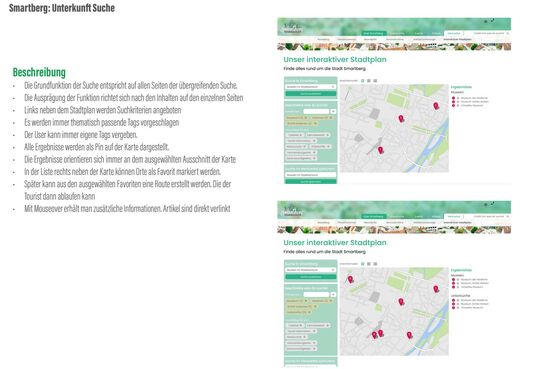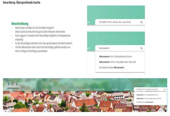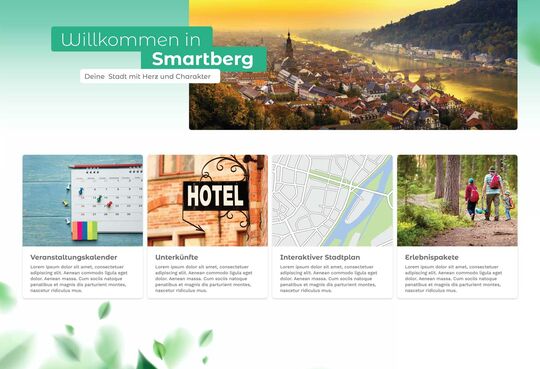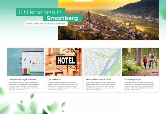 Smartberg möchte zu einer attraktiven Stadtmarke werden, um Touristen anzuziehen. Die Webseite soll hierzu um eine Art Serviceplattform erweitert werden. Natürlich handelt es sich bei Smartberg um eine fiktive Stadt, die aber Orten wie Freiburg und Tübingen nachempfunden wurde.