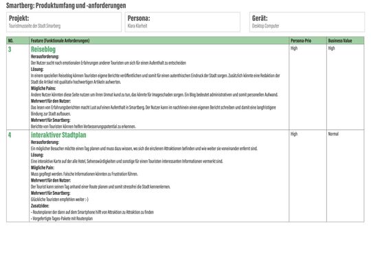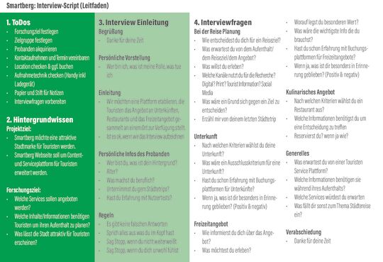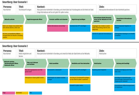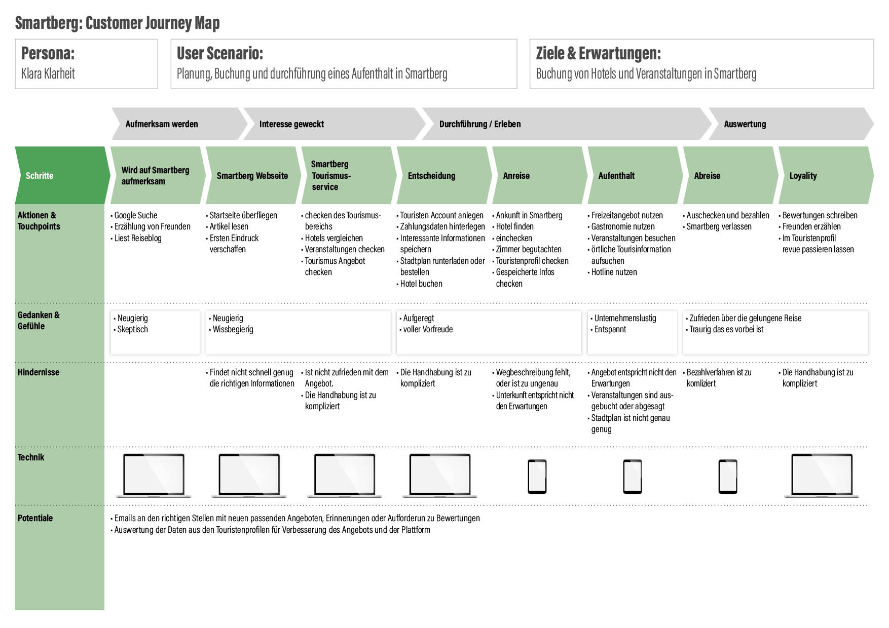 Teil drei der Analysephase war die Erstellung einer Customer Journey Map. Hierbei ging es darum, die Schritte die ein Tourist durchläuft aufzuzeigen und dabei Gedanken und Gefühle, Ärgernisse oder mögliche Chancen zu beleuchten.
