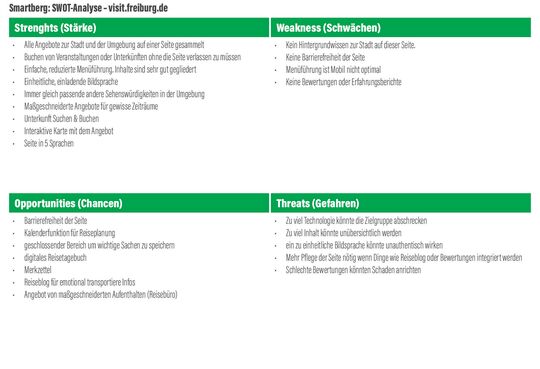 Um das dann noch auf einem Blick zusammenzufassen, wurde die SWOT-Methode angewandt.