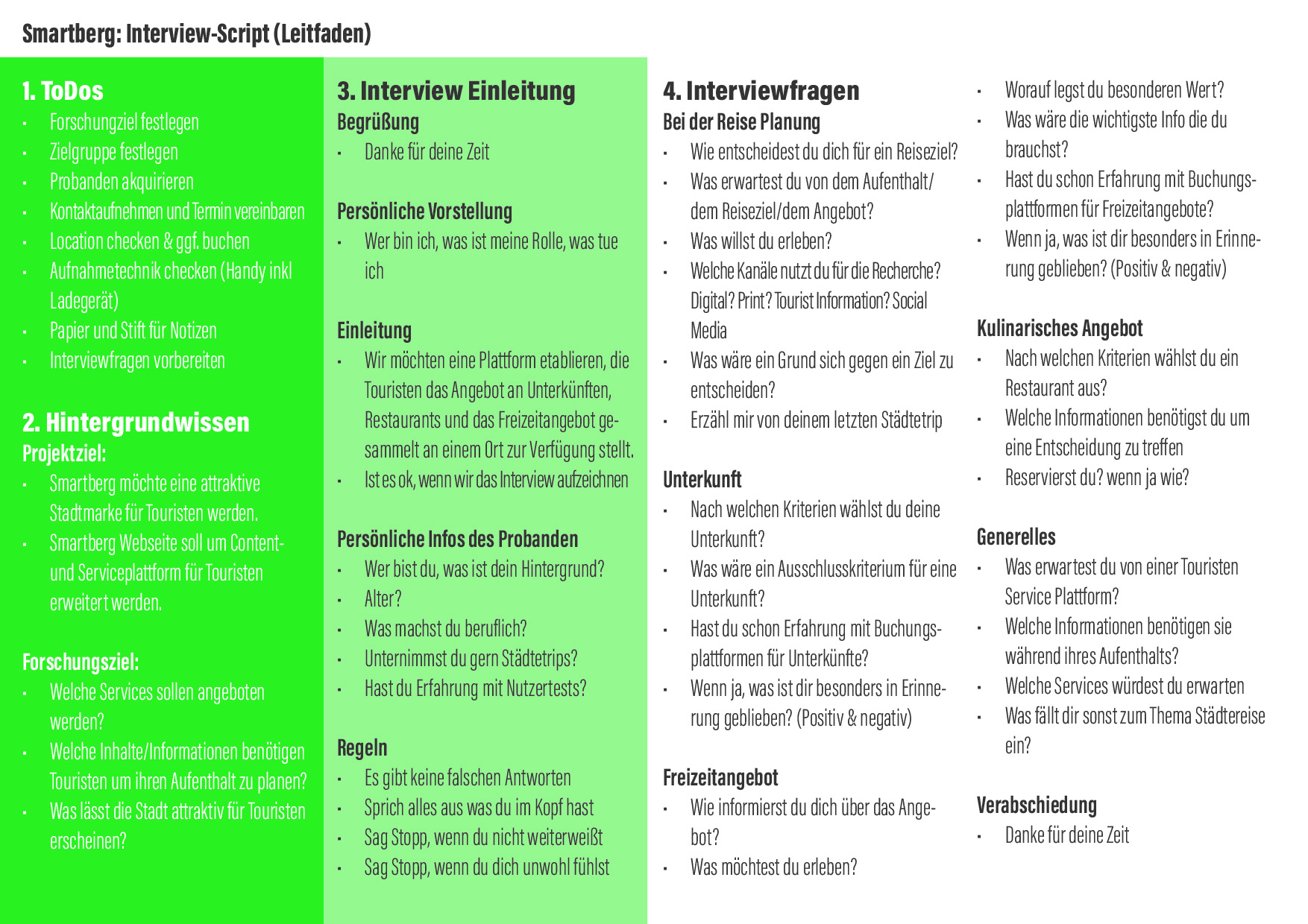 Für diese Aufgabe bin ich in die Rolle eines User Researchers geschlüpft. Die Aufgabe war, mit einer Auswahl an Touristen eine Interview-Studie durchzuführen um ein Verständnis für die Bedürfnisse und Anforderungen der Zielgruppe zu erhalten. Zu diesem Zweck habe ich einen Interview Leitfaden entwickelt und auch Interviews durchgeführt.
