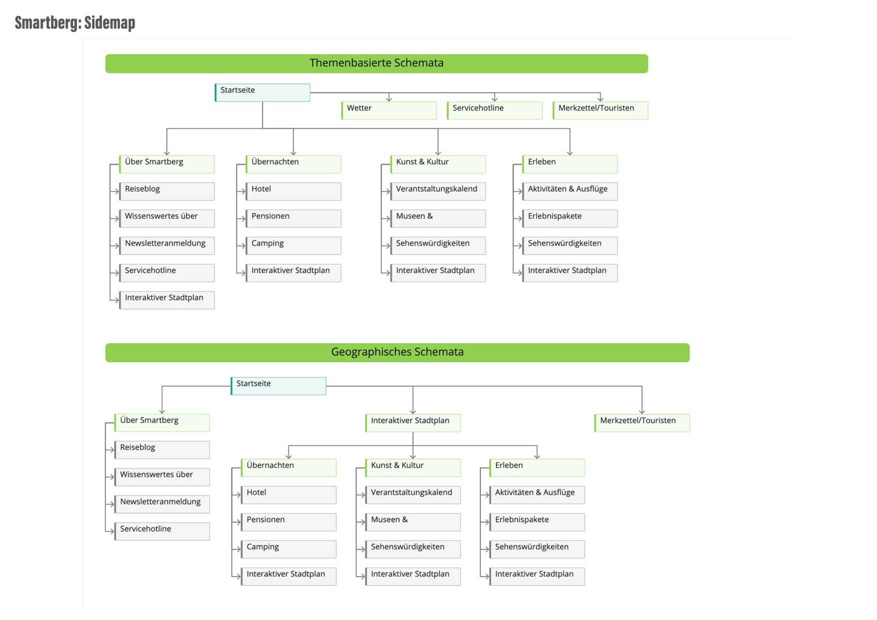 Sidemaps stellen die Struktur von Webseiten dar, inklusive aller Verzeichnisse und Unterseiten. Dabei sind sie nicht für die User gedacht. Für diese gibt es eine sehr viel übersichtlichere Navigation. Es gibt verschiedene Schemata eine Sidemap zu erstellen. In unserem Beispiel sehen wir ein Themenbezogenes Schemata, und ein geographisches Schemata.