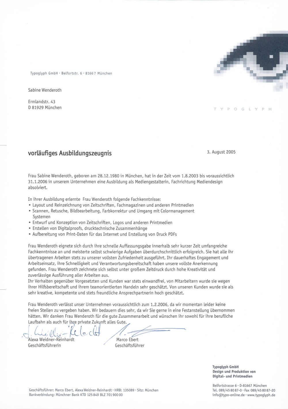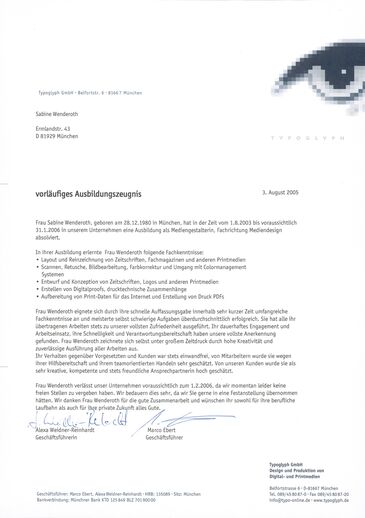 Während der zweieinhalbjährigen Ausbildung bei der Firma Typoglyph konnte ich mir fundierte Kenntnisse über alle marktrelevanten Grafik-Programme sowie umfassendes drucktechnisches Wissen aneignen. Der Schwerpunkt der Firma Typoglyph liegt auf Verlagsprodukten. Bei meinem Hauptprojekt handelte es sich um den Designguide, welchen ich während der kompletten Zeit meiner Ausbildung selbstständig gestalten konnte. Die damit verbundene Verantwortung beschränkte sich dabei nicht auf den Aufbau des Layouts, sondern umfasste auch die Gestaltung und Verwaltung der einzelnen Anzeigen und die intensive Zusammenarbeit mit Kunden und der Druckerei. Außerdem konnte ich bei Typoglyph erste Erfahrungen in der Gestaltung verschiedener Publikationen sammeln.